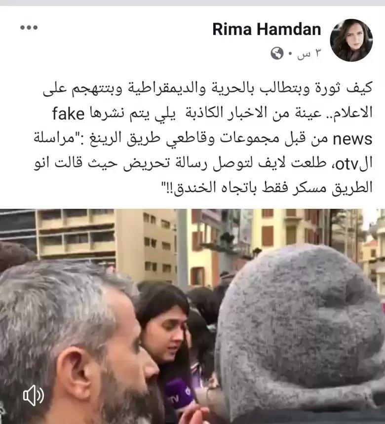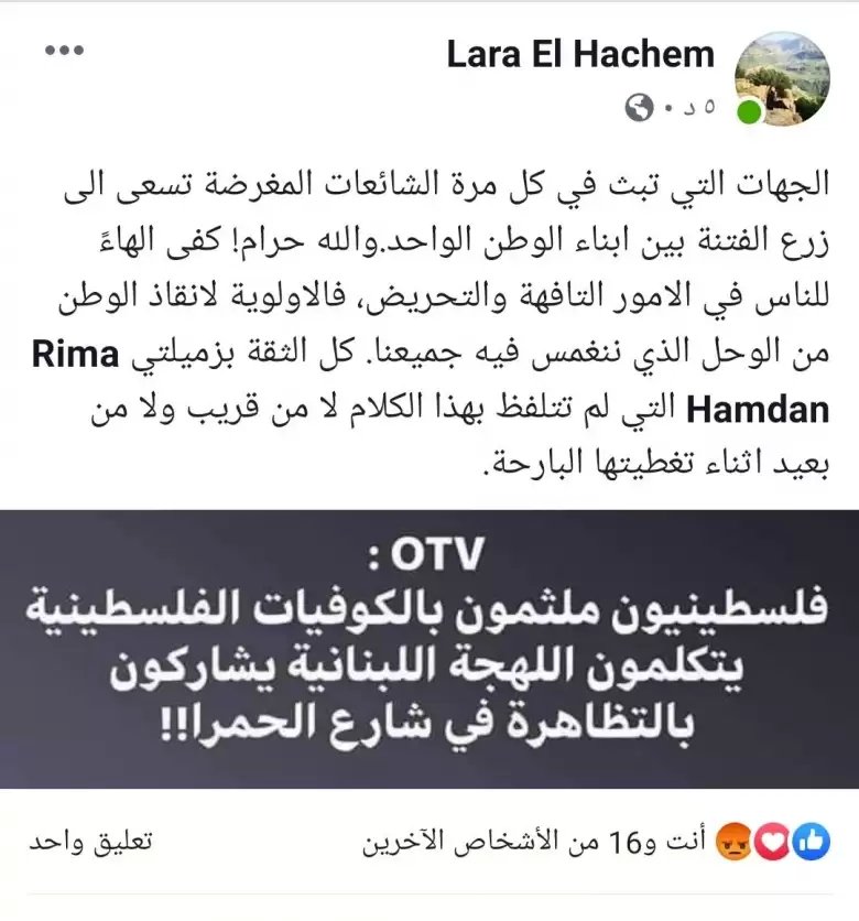 الجهات التي تبث في كل مرة الشائعات المغرضة تسعى الى زرع الفتنة بين ابناء الوطن الواحد.والله حرام! كفى الهاءً للناس في الامور التافهة والتحريض، فالاولوية لانقاذ الوطن من الوحل الذي ننغمس فيه جميعنا." وتابعت "كل الثقة بزميلتي ريما حمدان التي لم تتلفظ بهذا الكلام لا من قريب ولا من بعيد اثناء تغطيتها البارحة."
