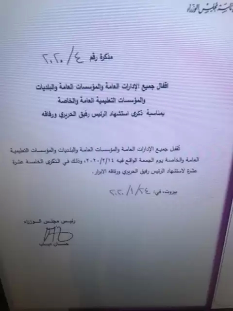 "تقفل جميع الادارات العامة والمؤسسات العامة والبلديات والمؤسسات التعليمية العامة والخاصة يوم الجمعة الواقع فيه 14/2/2020، وذلك في الذكرى الخامسة عشرة لاستشهاد الرئيس رفيق الحريري ورفاقه الابرار".