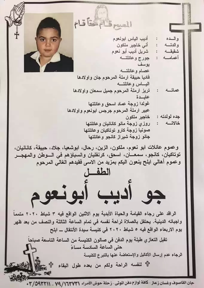 توفي الطفل جو أبو نعوم بعد ان أصابته الانفلونزا الموسمية. وتدهورت حالته الصحية سريعاً وما لبث ان فارق الحياة بحسب ما ذكرت صفحات اخبارية.