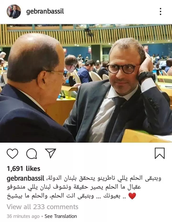 عايد رئيس التيار الوطني الحر النائب جبران باسيل الرئيس ميشال عون في عيد ميلاده الخامس والثمانين عبر حسابه على الإنستغرام: وبتبقى الحلم يللي ناطرينو يتحقق بلبنان الدولة، عقبال ما الحلم يصير حقيقة ونشوف لبنان يللي منشوفو بعيونك ... وبتبقى انت الحلم، والحلم ما بيشيخ .