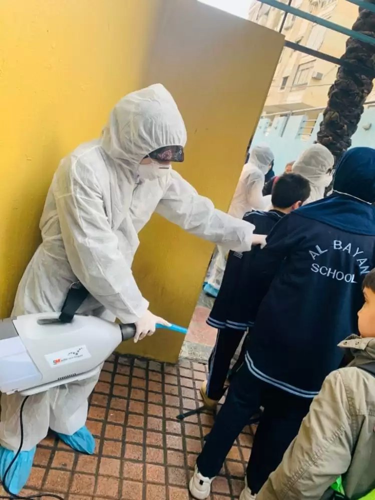 قامت مدرسة البيان في حي الأبيض بحملة تعقيم واسعة لمواجهة فيروس كورونا.