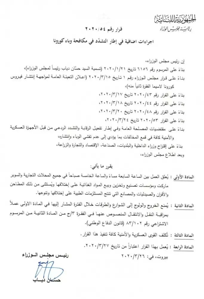 أصدر رئيس مجلس الوزراء د. حسان دياب القرار ٢٠٢٠/٥٤ ويتضمن إجراءات إضافية في إطار التشدد في مكافحة وباء كورونا