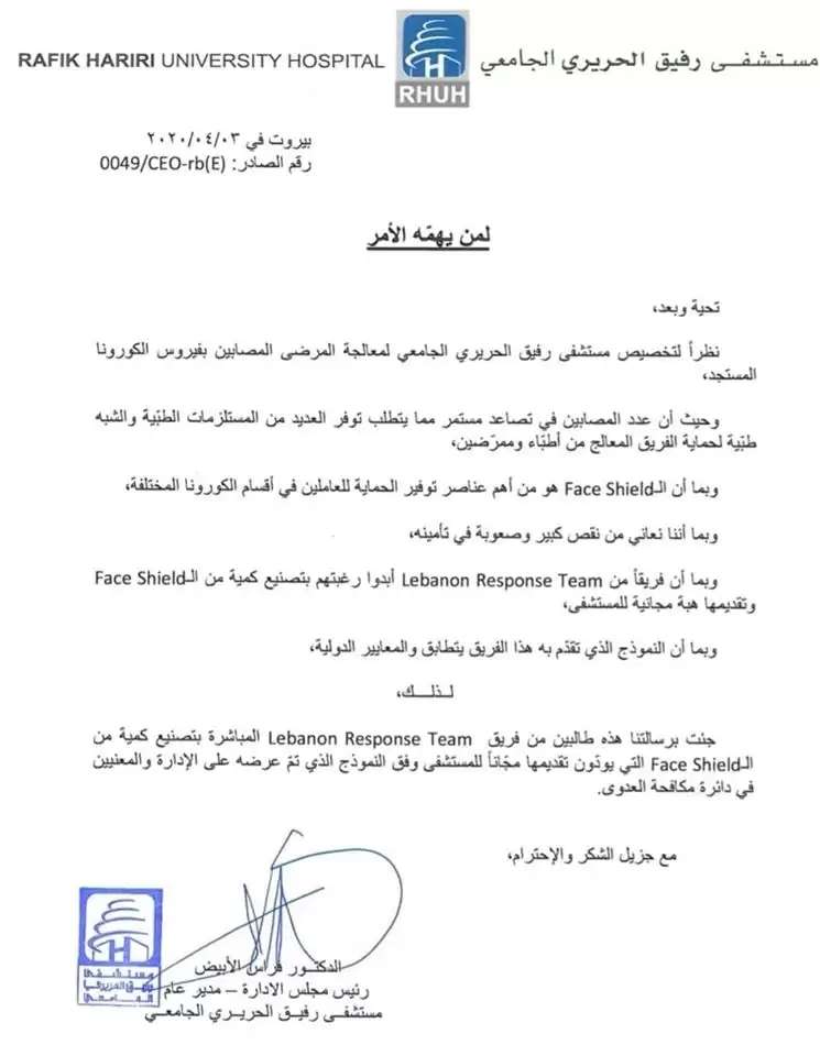 تتواصل مبادرة الشبان اللبنانيين المهندسين الذين تكاتفوا للدعم في مواجهة الكورونا. وبعد أن أبدى فريق من Lebanon Response Team رغبته بتصنيع كمية من الـ"Face Shield" وتقديمها هبة لمستشفى رفيق الحريري الجامعي الذي يعاني نقصاً منها، طلب من الفريق المباشرة بالتصنيع وفق النموذج الذي تم عرضه على الادارة والمعنيين في ظائرة مكافحة عدوى فيروس كورونا.