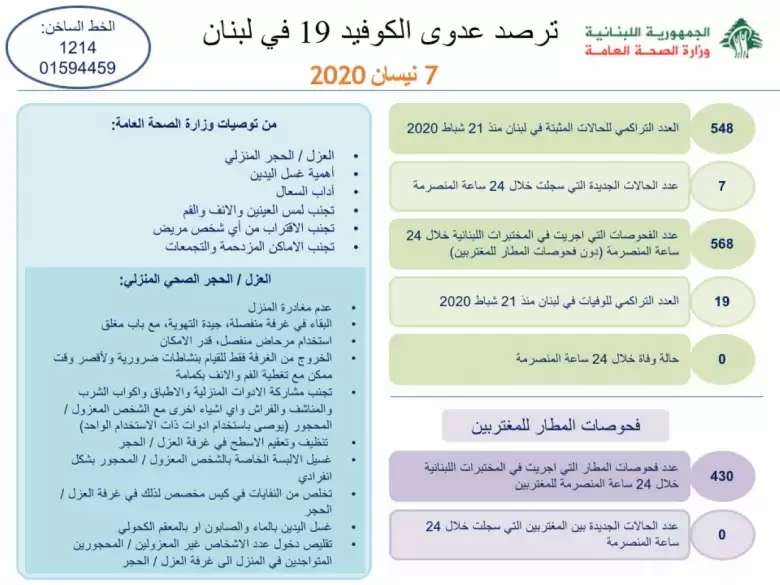 أعلنت وزارة الصحة العامة في تقريرها اليومي عن وباء كورونا تسجيل 7 إصابات جديدة رفعت العدد الاجمالي للحالات المثبتة الى 548.