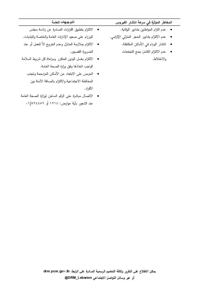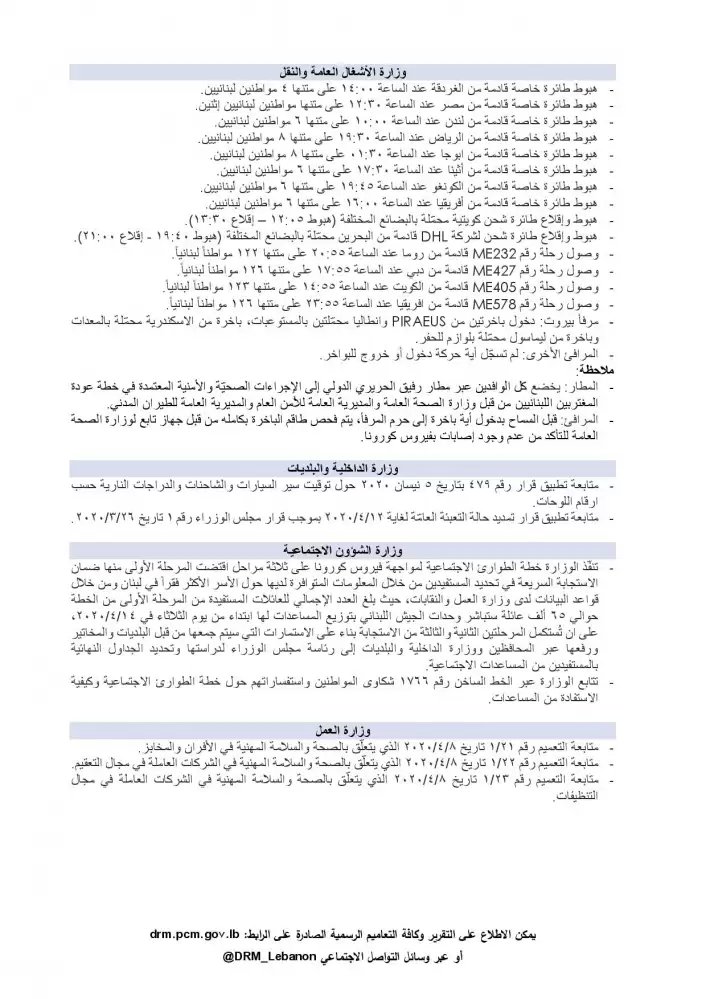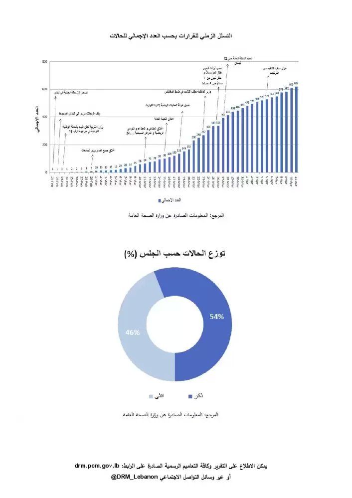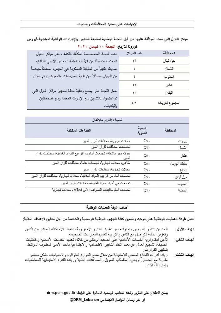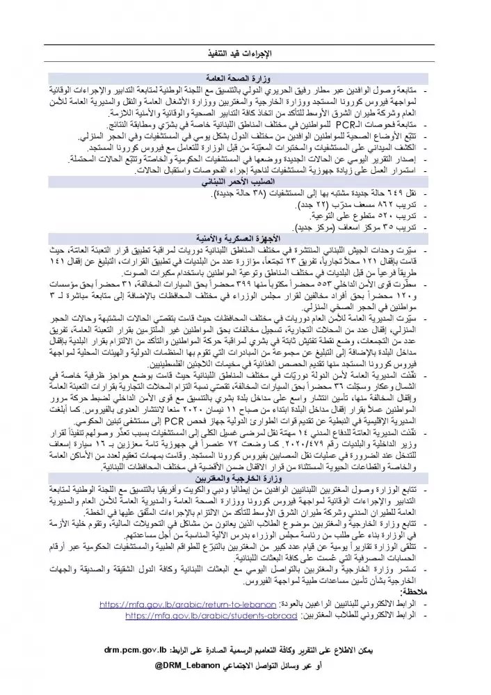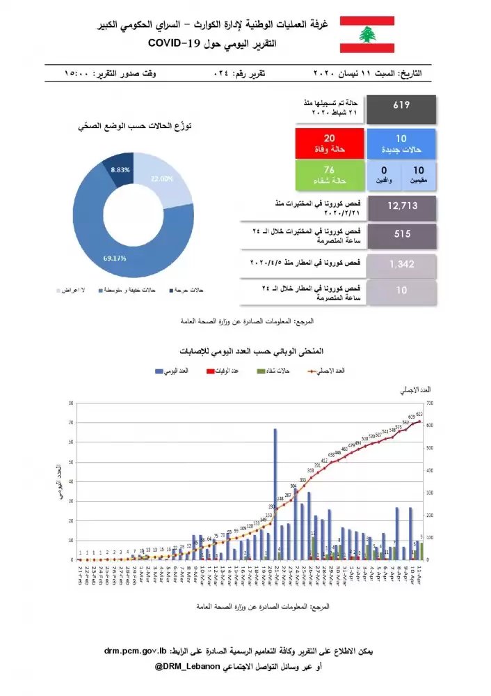 أصدرت غرفة العمليات الوطنية لإدارة الكوارث تقريرها اليومي المتعلق بانتشار فيروس كورونا في لبنان بتاريخ اليوم السبت 11-4-2020.