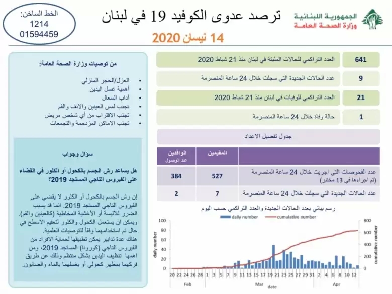 اعلنت وزارة الصحة تسجيل 9 اصابات جديدة بكورونا، ليرتفع عدد الحالات المثبتة الى 641