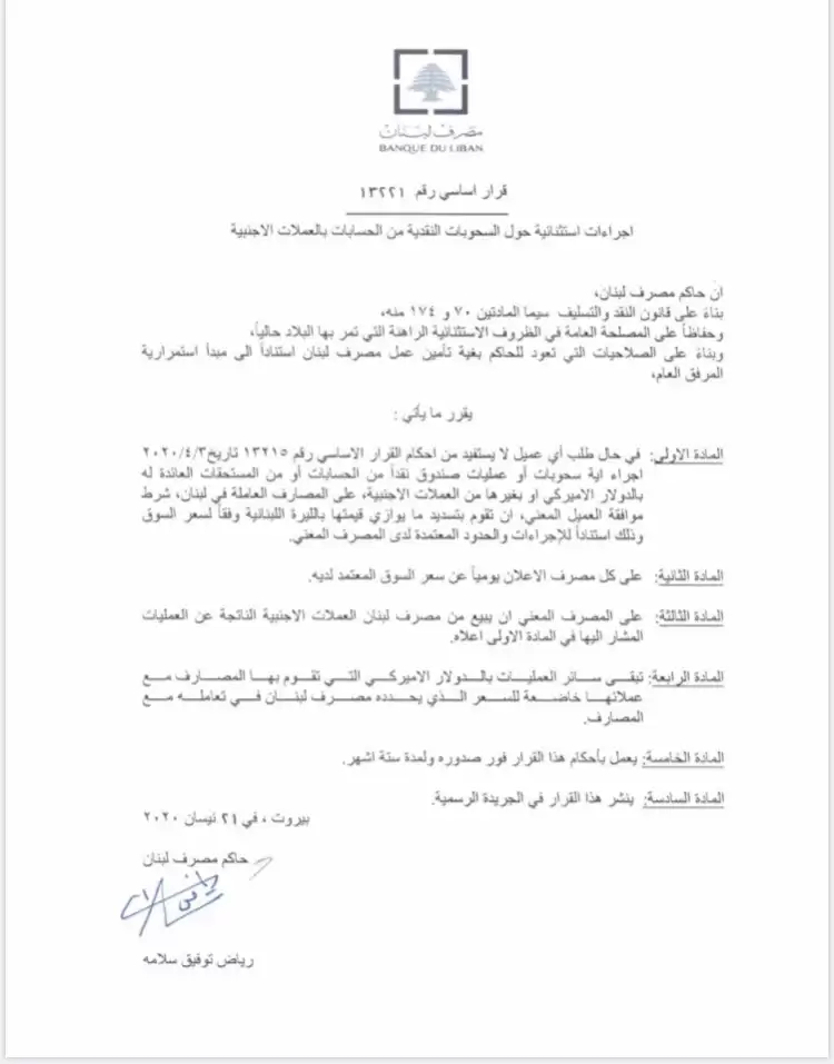 أصدر مصرف لبنان تعميما حول السحوبات النقدية من الحسابات بالعملات الأجنبية، وفيه أنه بحال طلب أي عميل لا يستفيد من احكام القرار الأساسي رقم 13215 تاريخ 3 نيسان 2020، إجراء أية سحوبات او عمليات صندوق نقدا من الحسابات او المستحقات العائدة له بالدولار الاميركي او بغيرها من العملات الاجنبية، على المصارف العاملة في لبنان، شرط موافقة العميل المعني، أن تقوم بتسديد ما يوازي قيمتها بالليرة اللبنانية وفقا لسعر السوق وذلك استنادا للاجراءات والحدود المعتمدة لدى المصرف المعني.