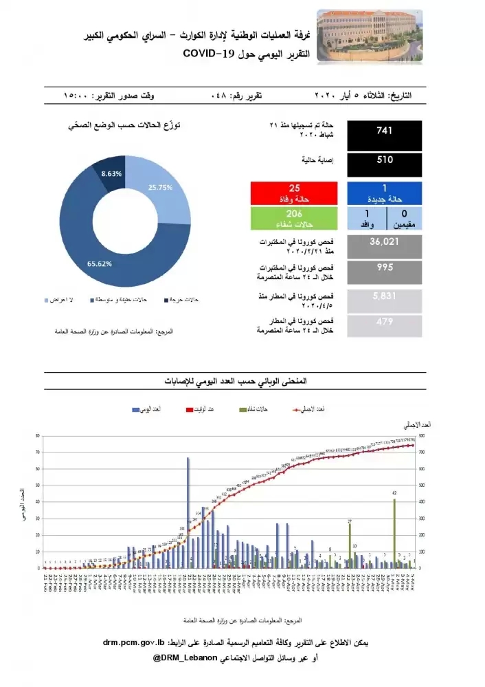 صدرت غرفة العمليات الوطنية لإدارة الكوارث تقريرها اليومي حول وباء كورونا المستجد، وجاء فيه: