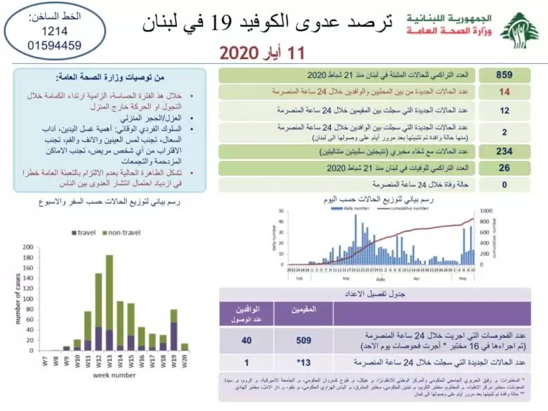 أصدرت وزارة الصحة تقريرها اليومي عن فيروس كورونا وجاء فيه: