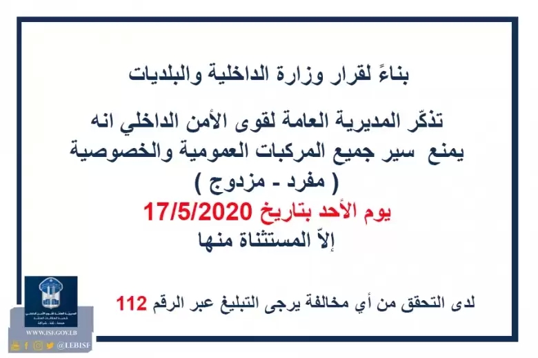 غردت قوى الأمن الداخلي عبر حسابها على توتير بأنها تذكر المواطنين بمنع سير جميع المركبات العمومية والخصوصية يوم غد الاحد الا المستثناة منها.