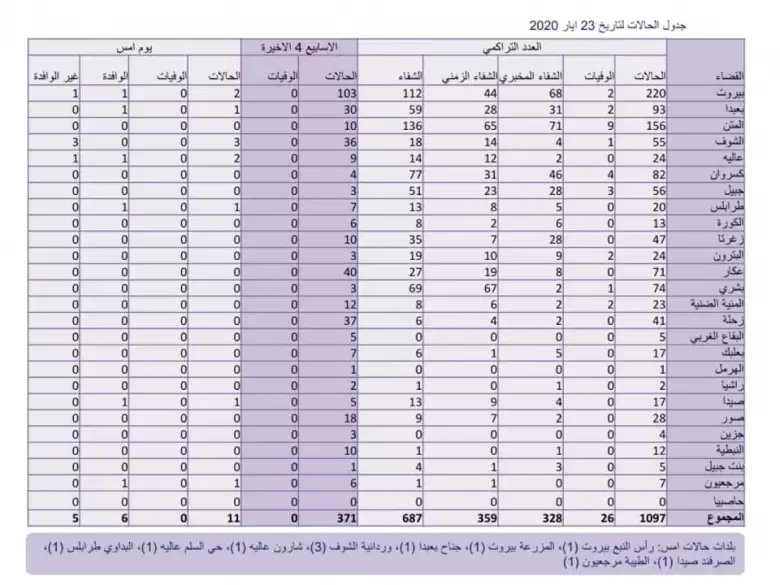 نشرت وزارة الصحة العامة في تغريدة على حسابها، جدولاً عن الحالات المصابة بكورونا في لبنان حتى 23 أيار 2020.