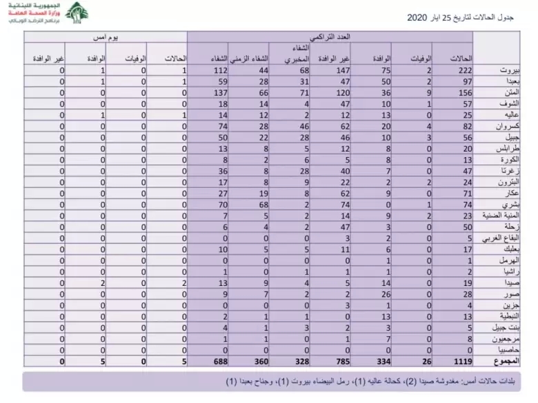 وكانت وزارة الصحة أعلنت اليوم تسجيل 5 اصابات جديدة بفيروس كورونا في لبنان في الساعات الماضية جميعهم من بين الوافدين ليرتفع العدد الاجمالي للاصابات الى 1119.