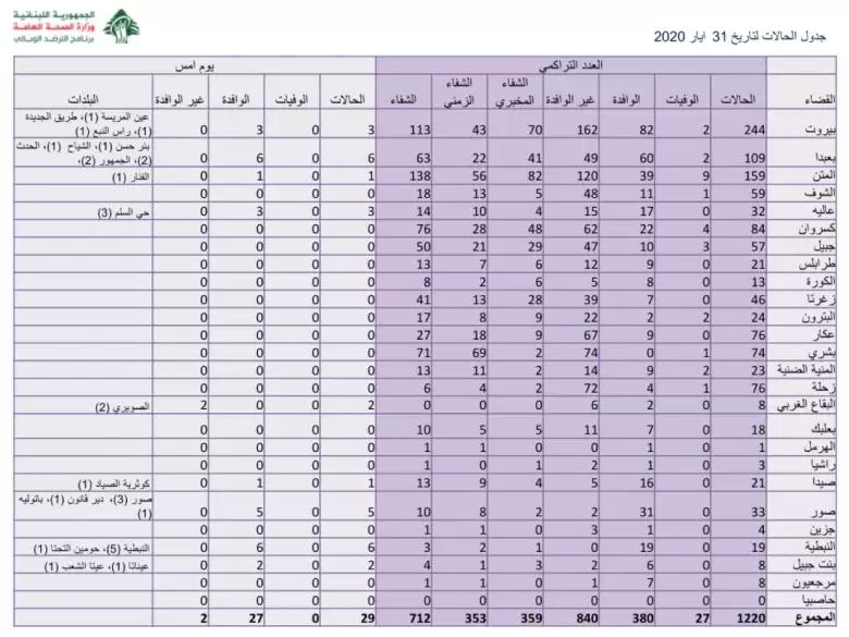 سجلت وزارة الصحة العامة 29 حالات كورونا جديدة، رفعت العدد التراكمي الى 1220 اصابة.