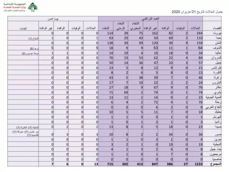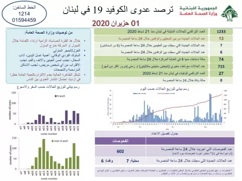 سجلت وزارة الصحة العامة 13 حالة كورونا جديدة، رفعت العدد التراكمي الى 1233 اصابة.