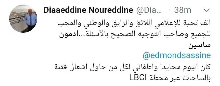 أثنى العديد من المتابعين على أداء ومهنية مراسل قناة الـLBCI إدمون ساسين في نقل الصورة وذلك خلال تغطية أحداث بيروت اليوم.