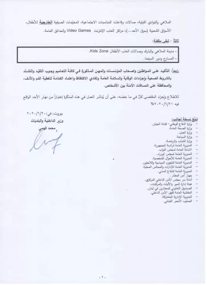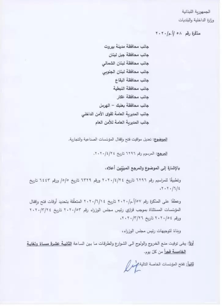 ويباشر العمل بهذه المذكرة اعتبارًا من نهار الأحد 21-06-2020.