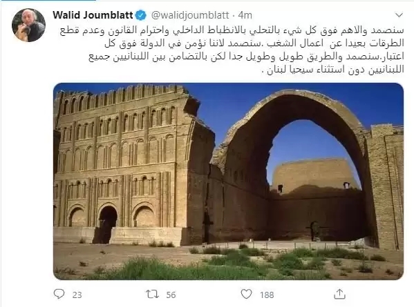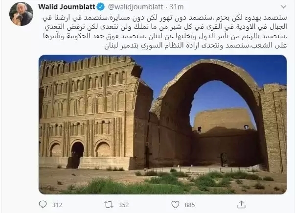 حذف رئيس الحزب التقدمي الاشتراكي وليد جنبلاط تغريدتين كان كتبهما على حسابه على "تويتر" فجر اليوم الأحد. وفي التفاصيل أنّ جبنلاط غرّد قائلاً: "سنصمد بهدوء لكن بحزم . سنصمد دون تهور لكن دون مسايرة. سنصمد في ارضنا في الجبال في الاودية في القرى في كل شبر من ما نملك ولن نتعدى لكن نرفض التعدي. سنصمد بالرغم من تآمر الدول وتخليها عن لبنان. سنصمد فوق حقد الحكومة وتآمرها على الشعب. سنصمد ونتحدى ارادة النظام السوري بتدمير لبنان".