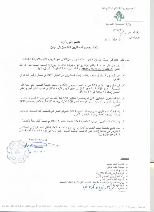 أصدرت وزارة الصحة العامة تعميماً يحمل الرقم 99 يتعلّق بجميع المسافرين القادمين إلى لبنان.
