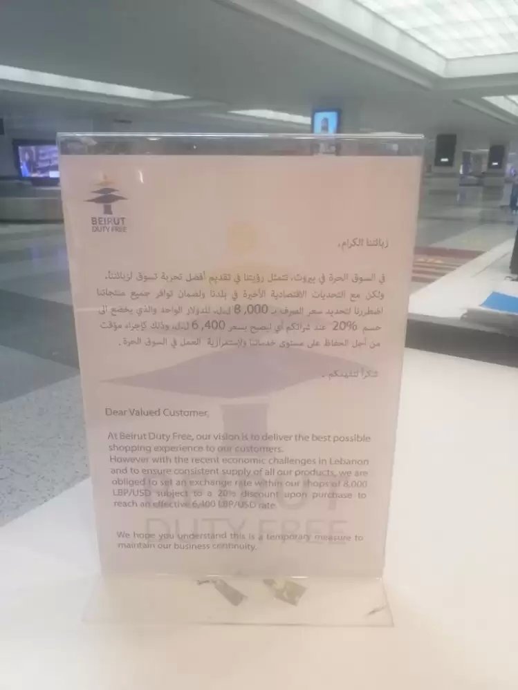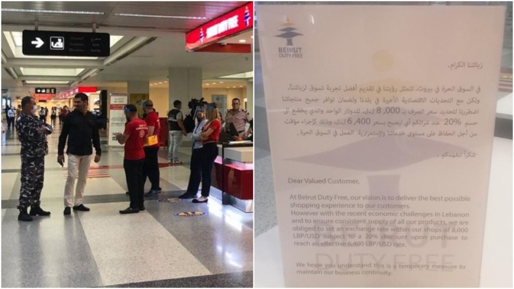 أعلنت "السوق الحرّة" في "مطار رفيق الحريري الدولي" – بيروت، تحديد سعر الصّرف بـ8000 ليرة لبنانية للدولار الواحد، والذي يخضع لحسم 20% عند الشراء ليصبح بسعر 6400 ليرة للدولار الواحد.