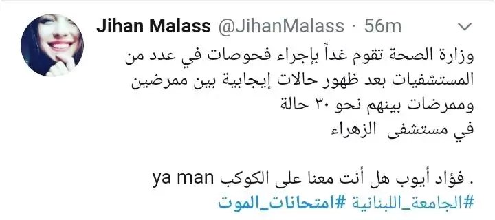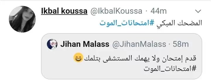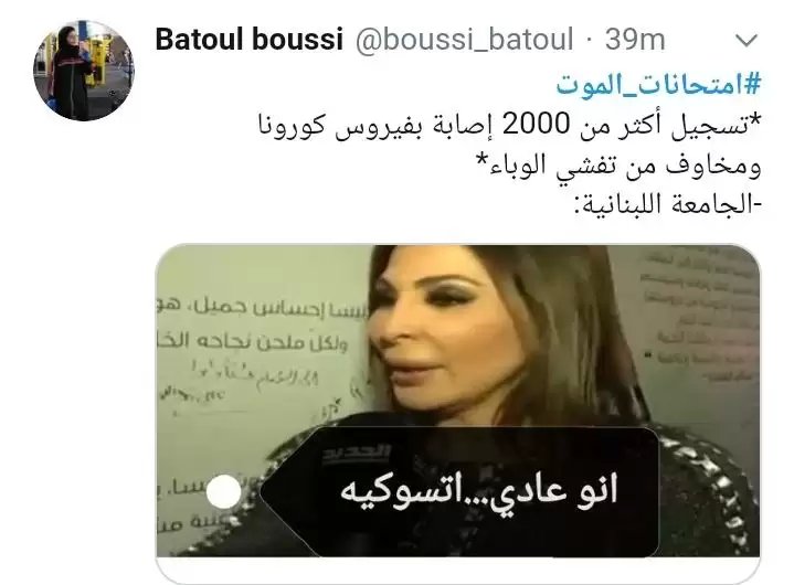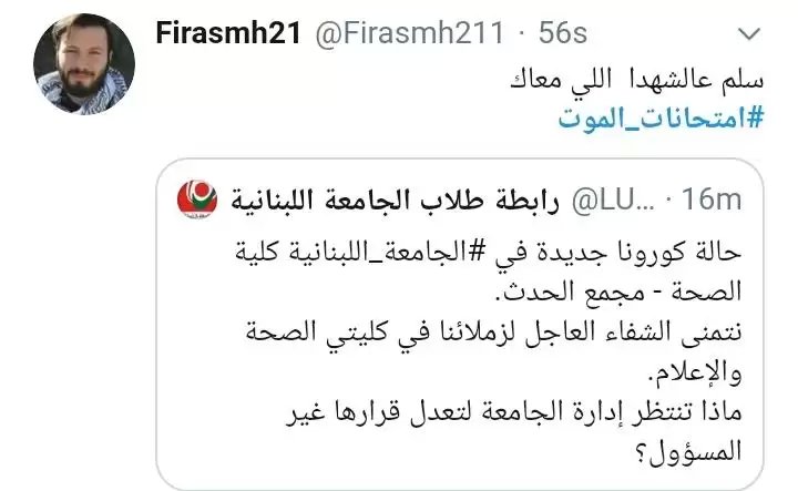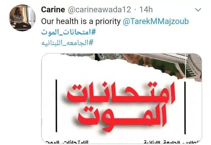 أطلق طلاب الجامعة اللبنانية بمختلف فروعها وكلياتها هاشتاغ #امتحانات_الموت في ظل إصرار رئاسة الجامعة على إجراء الإمتحانات حضوريا رغم تفشي فيروس كورونا وارتفاع حالات الإصابات على الأراضي اللبنانية.
