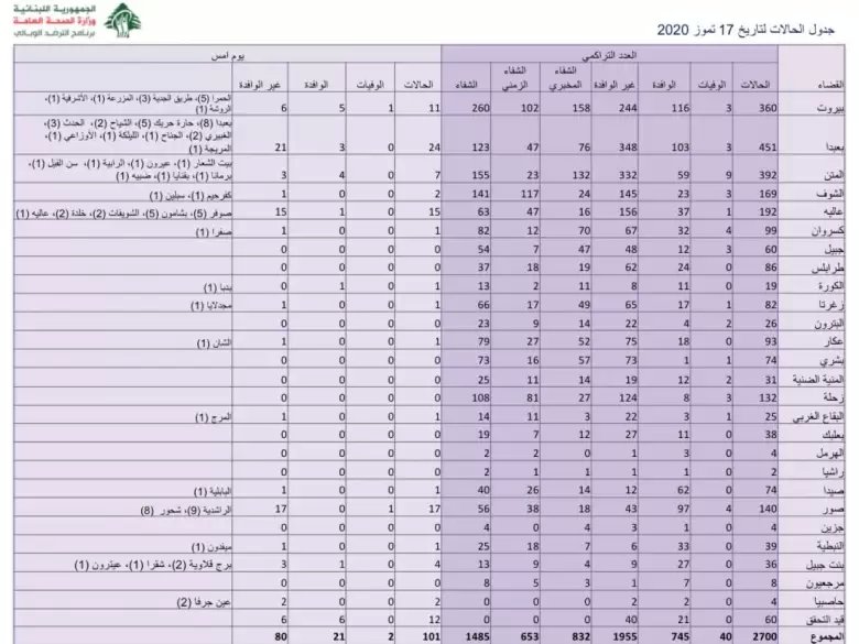 وأوضحت أنّه "تمّ تسجيل 80 حالة إصابة بين المقيمين خلال الساعات الـ24 الماضية (47 منهم من المخالطين)، و21 حالة بين الوافدين (من العراق، الكويت، سلطنة عمان، سوريا، الإمارات، تركيا، نيجيريا والولايات المتحدة الأميركية)"، لافتةً إلى أنّه "لم يتم تسجيل حالات شفاء جديدة، ليبقى العدد الإجمالي للمتعافين من الفيروس مستقّرًا عند 1425 حالة. كما أنّه لم يتم تسجيل أي حالة وفاة جديدة خلال الساعات الـ24 الماضية".