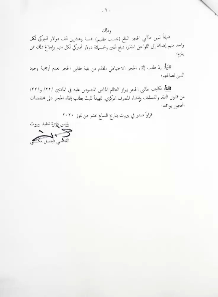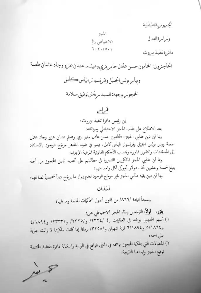 ويأتي القرار بناءً على طلب الحجز الاحتياطي المقدم من الدائرة القانونية لمجموعة "الشعب يريد اصلاح النظام" ممثلة بالمحامين حسن بزي، هيثم عزو، جاد طعمة، جوزيف وانيس، بيار الجميل، فرنسواز كامل، باسل عباس.