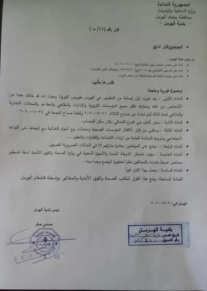 أصدرت بلدية الهرمل بياناً ينص على الإجراءات العاجلة التي طلبت من الاهالي التقيد بها، وذلك اثر تسجيل إصابة كورونا في البلدة.