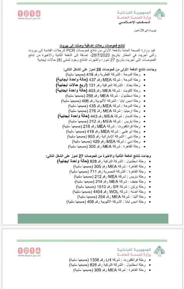 أعلنت وزارة الصحة الدفعة الأولى من نتائج فحوص PCR للرحلات الاتية إلى بيروت والتي أجريت في المطار بتاريخ 28-07-2020، إضافة إلى الدفعة الثانية والاخيرة من نتائج الفحوصات التي أجريت بتاريخ 27 تموز. وأظهرت النتائج وجود 8 حالات ايجابية.