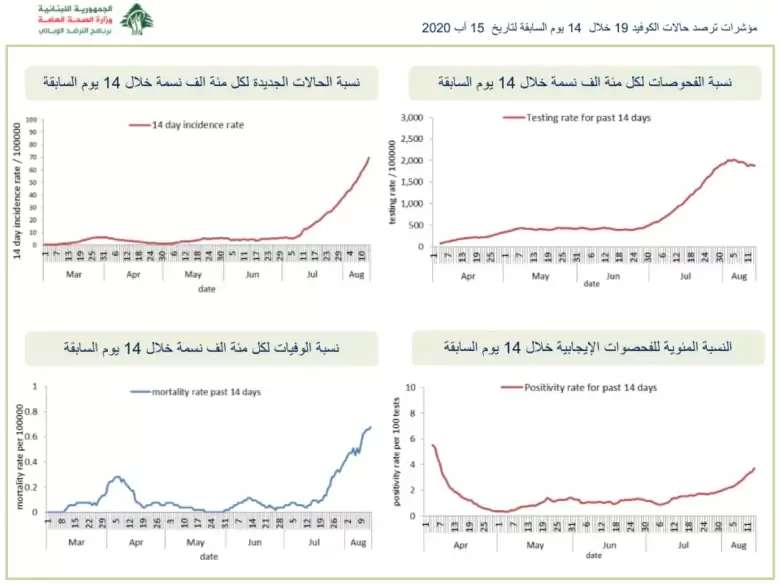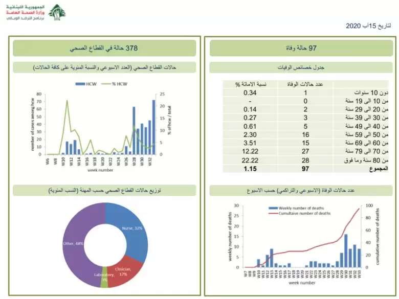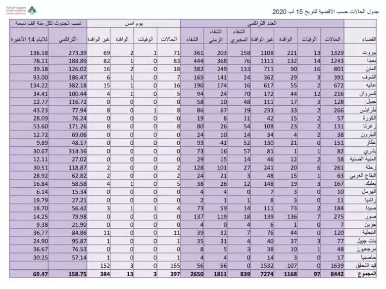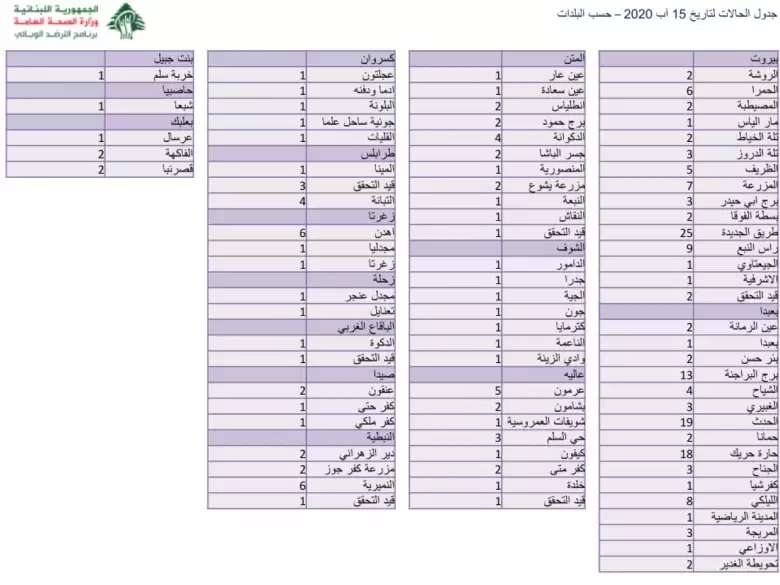 أعلنت وزارة الصحة عن تسجيل 397 إصابة جديدة بفيروس كورونا في لبنان و3 وفيات.