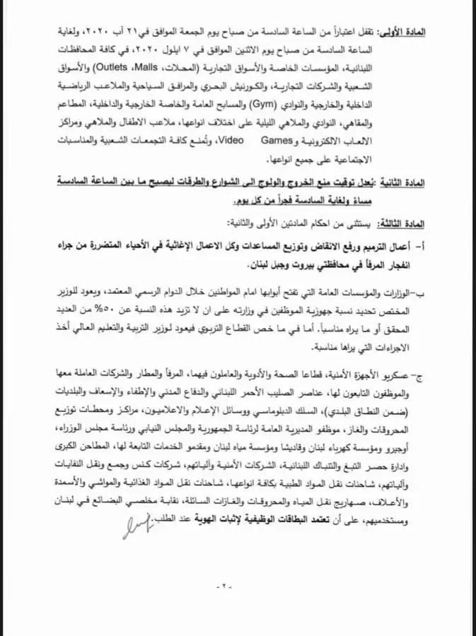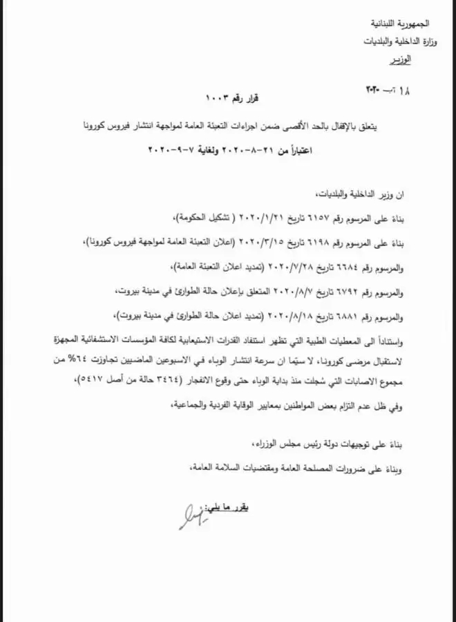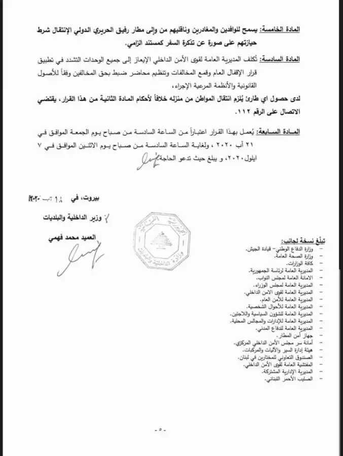 صدر عن وزير الداخلية والبلديات في حكومة تصريف الاعمال العميد محمد فهمي تعميماً حول اقفال البلد للوقاية من كورونا.