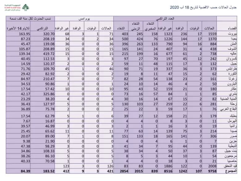 اعلنت وزارة الصحة العامة تسجيل 421 اصابة كورونا جديدة رفعت العدد التراكمي للحالات المثبتة الى 9758.