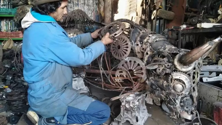 يقوم أولاً بتنظيف القطع المعدنية ثم لحامها معاً لصنع القطع الفنية قبل أن يضفي عليها بالألوان لمسات إبداعية أخيرة.