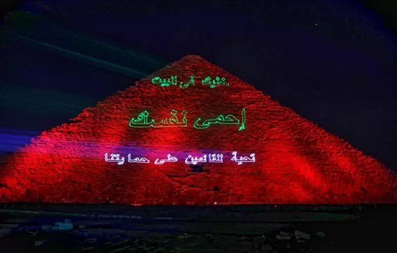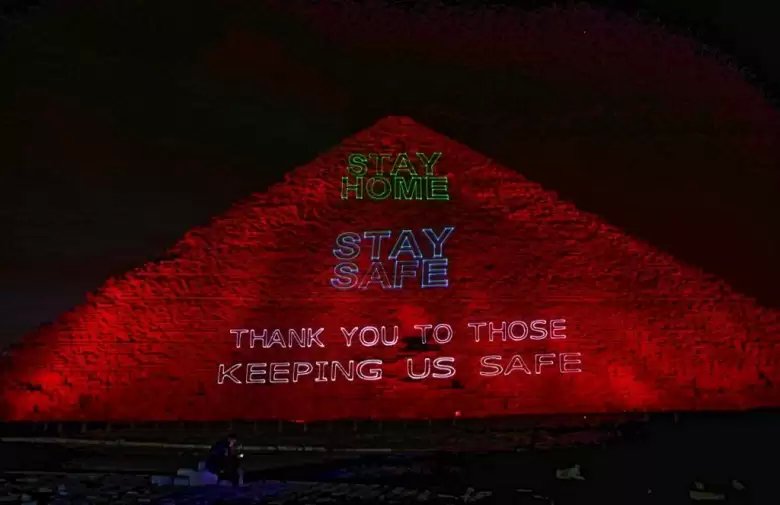 نشرت الصفحة الرسمية لوزارة السياحة والآثار المصرية صور لرسالة من أمام هرم خوفو الى شعب مصر وشعوب العالم دعت الالتزام فى المنازل منعا لتفشى فيروس كورونا.