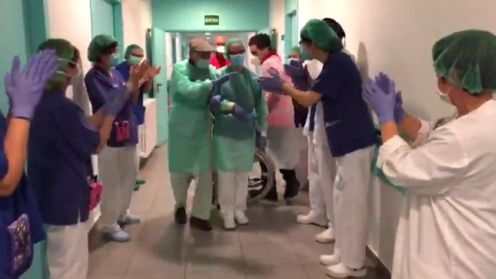 رحب فريق من الأطباء بتصفيق حار لخروج مسن إسباني بالغ من العمر 93 عاما من المستشفى بعد شفائه من فيروس كورونا.