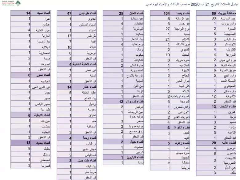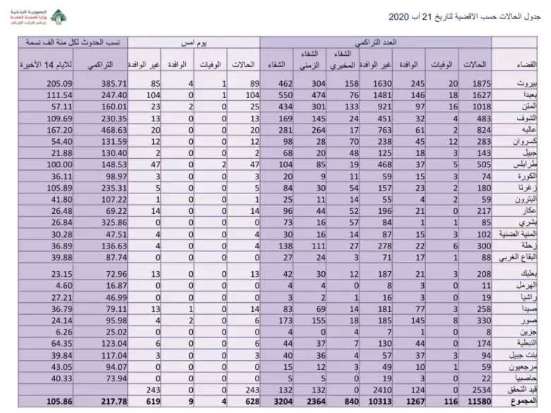 أعلنت وزارة الصحة العامة في تقريرها اليومي، "تسجيل 628 حالات جديدة مُصابة بفيروس "كورونا" المستجد (كوفيد 19)، ليرتفع العدد التراكمي للإصابات منذ 21 شباط الماضي إلى 11580 حالة".