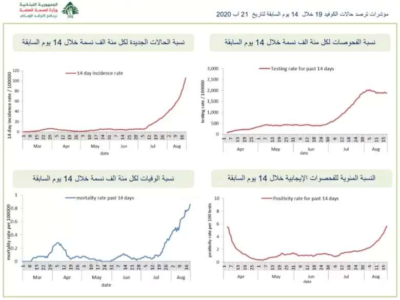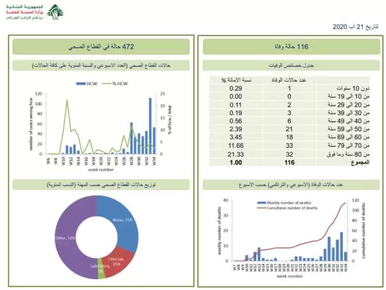 وأوضحت أنّه "تمّ تسجيل 619 حالة إصابة بين المقيمين خلال الساعات الـ24 الماضية، و9 حالات بين الوافدين"، لافتةً إلى أنّه "تمّ تسجيل 3 حالات وفاة جديدة خلال الساعات الـ24 الماضية، ليرتفع العدد الإجمالي للوفيات إلى 116". وأشارت الوزارة إلى "أنّها أجرت 7600 فحص مخبريّ لكشف الإصابة بـ"كورونا" خلال الساعات الـ24 الماضية، منها 2037 فحصًا في المطار".