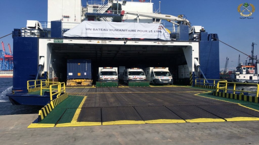أفادت قيادة الجيش عبر تويتر أن: باخرة فرنسية محملة بحوالي ٢٥٠ طن من المساعدات وصلت الى بيروت