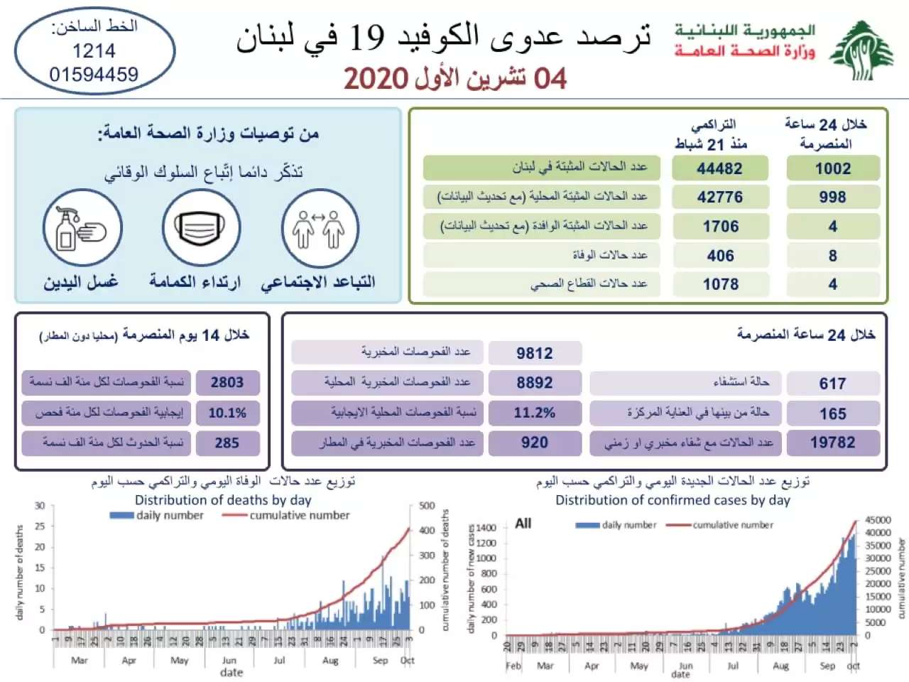 أعلنت وزارة الصحة العامة تسجيل 1002 اصابتي كورونا جديدة رفعت العدد التراكمي منذ 21 شباط الماضي الى 44482 حالة.