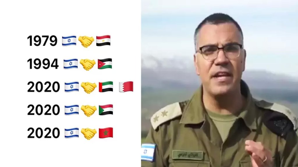 نشر المتحدث باسم جيش الإحتلال الإسرائيلي رموزاً عنون فيها تاريخ التطبيع مع الكيان الإسرائيلي. حيث وضع العلم الإسرائيلي ورمز المصافحة إلى جانب أعلام الدول العربية التي أعلنت إقامة علاقات دبلوماسية مع الجانب الإسرائيلي. كما نشر أيضاً عبارة "يَا أَيُّهَا الَّذِينَ آمَنُوا ادْخُلُوا فِي السِّلْمِ كَافَّةً"!