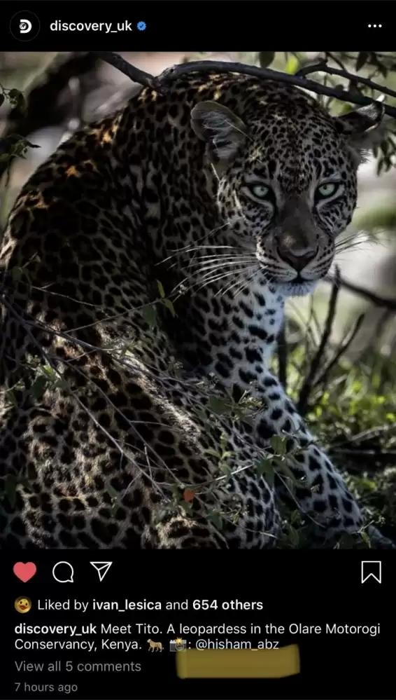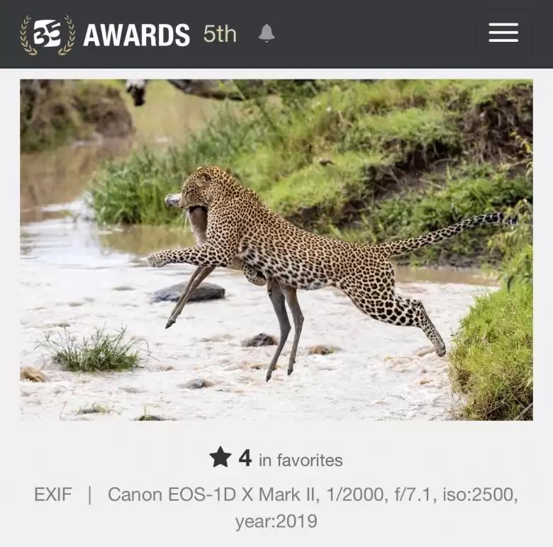 لقطة أنثى النمر المرقط وهي تقفز فوق النهر ممسكة بفريستها اقتنصها في كينيا وهي من ضمن الصور الفائزة في المسابقة. حين التقطها لم يكن قد خطط للمشاركة في المسابقة، إلا أنه حين شارك، كان متاكداً من الفوز. فبثقة يقول "أنا عارف شو هي الصورة" في إشارة إلى قيمتها.