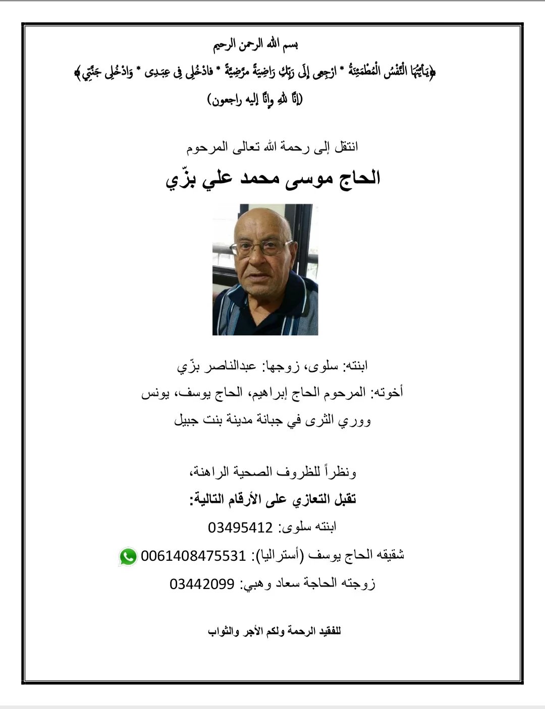 انتقل إلى رحمة الله تعالى الحاج موسى محمد علي بزي، وقد وري الثرى في جبانة بنت جبيل.