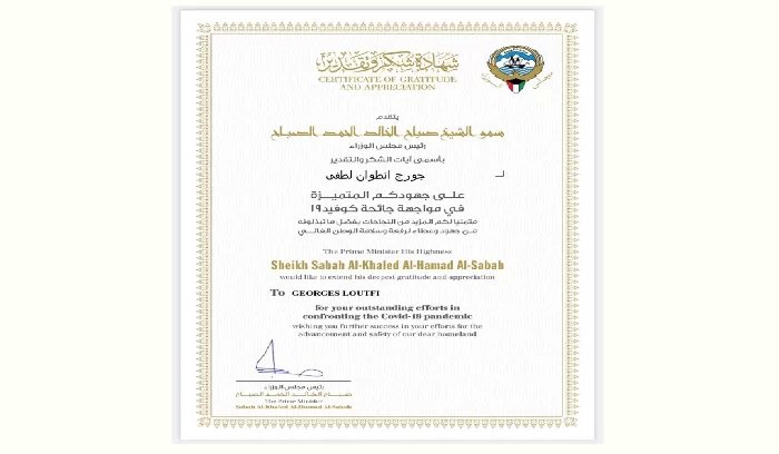 منح رئيس مجلس وزراء دولة الكويت الشيخ صباح الخالد الحمد الصباح الطبيب اللبناني جورج انطوان لطفي شهادة شكر وتقدير على الجهود المتميزة التي بذلها في مواجهة جائحة كوفيد في الكويت، متمنيا له "المزيد من النجاحات بفضل ما يبذله من جهود وعطاء لرفعة وسلامة الوطن الغالي".