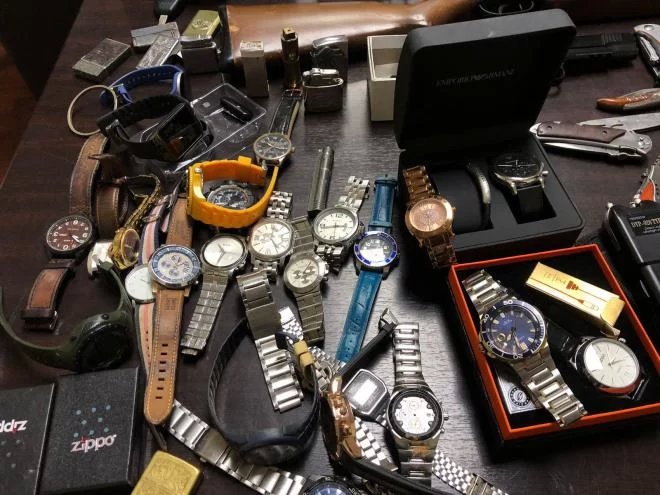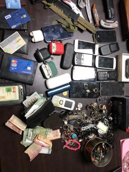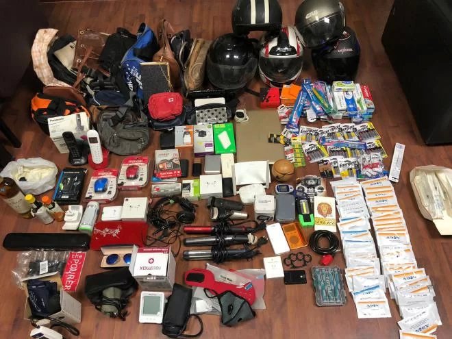 بتفتيشه ومنزله، تمّ ضبط كميّة كبيرة من المسروقات (أجهزة خلوية، ساعات يد، آلات لفحص الضغط، خوذ واقية، آلات لتصفيف الشّعر...)، إضافةً إلى كميّة من حشيشة الكيف وحبوب مخدّرة، وخناجر و"سكاكين ست طقّات"...