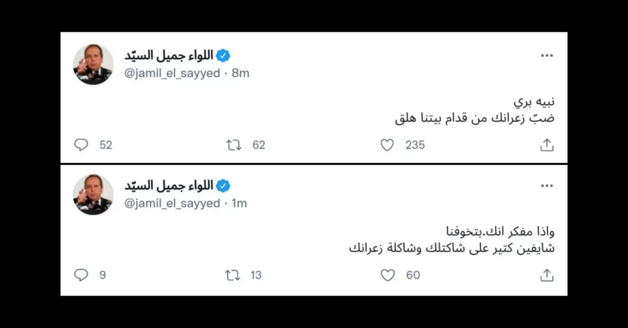 غرد النائب جميل السيد عبر حسابه على تويتر متوجها لرئيس مجلس النواب نبيه بري قائلاً: "نبيه بري ضبّ زعرانك من قدام بيتنا هلق".