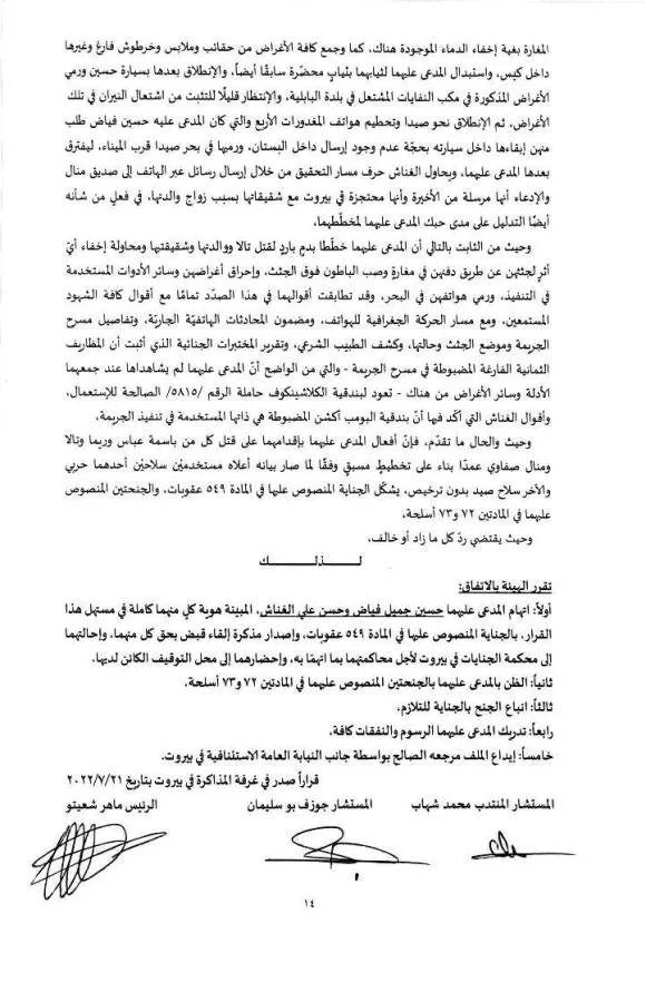 ويروي القرار الواقع في 14 صفحة تفاصيل اعترافات المتهمين. وكيف اعترفا بارتكاب الجريمة بدم بارد بعدما خططا لها بعناية ودقة متناهيين وقد عمدا الى تنفيذ كل ما خططا له بكامل تفاصيله.