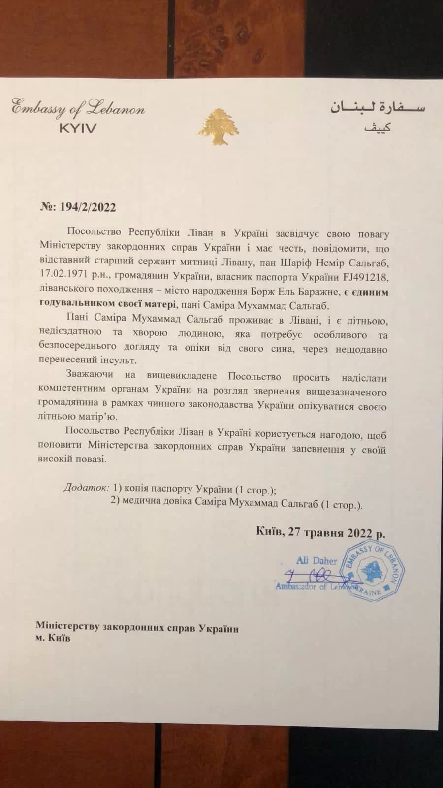 ناشد اللبناني الرقيب أول متقاعد من الجمارك اللبنانية وحامل الجنسية الأوكرانية شريف نمر سلهب عبر “أحوال” وزارة الخارجية اللبنانية النظر بوضعه وظروفه في أوكرانيا ومساعدته على مغادرتها والعودة الى لبنان بسبب الظروف القاسية التي يعيشها.