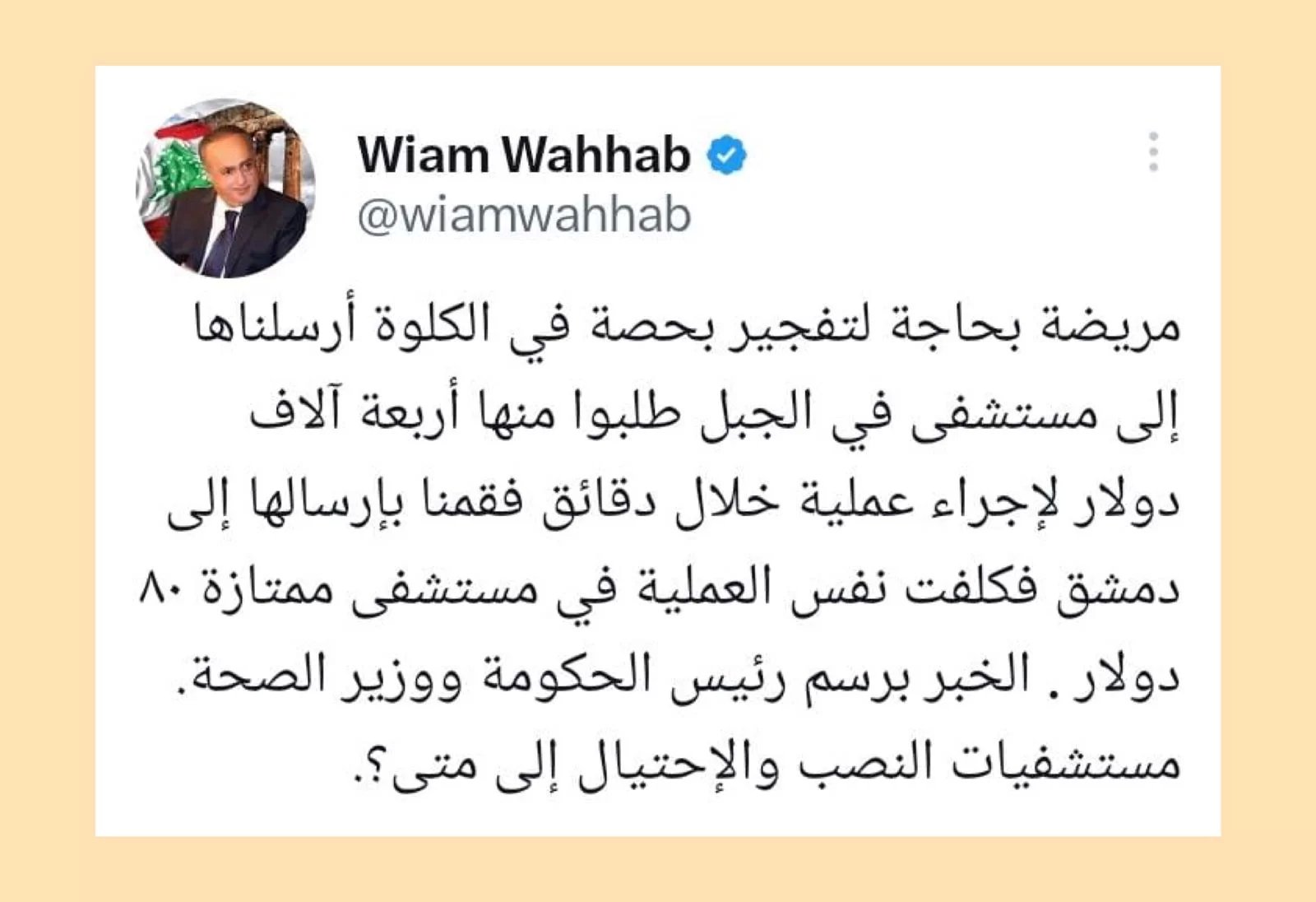 غرد رئيس حزب التوحيد اللبناني وئام وهاب على حسابه عبر تويتر: "مريضة بحاجة لتفجير بحصة في الكلوة أرسلناها إلى مستشفى في الجبل طلبوا منها أربعة آلاف دولار لإجراء عملية خلال دقائق فقمنا بإرسالها إلى دمشق فكلفت نفس العملية في مستشفى ممتازة ٨٠ دولار . الخبر برسم رئيس الحكومة ووزير الصحة. مستشفيات النصب والإحتيال إلى متى؟".