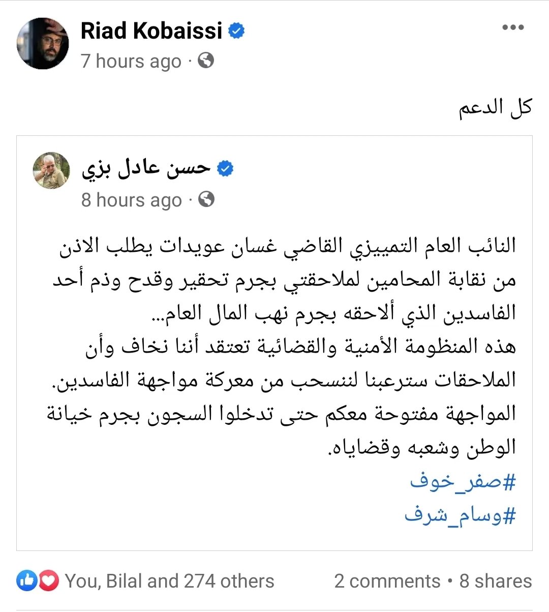 وأوضح بزي أنّ "هذه معركة جانبية من المواجهة مع منظومة الفساد وأذرعتها".