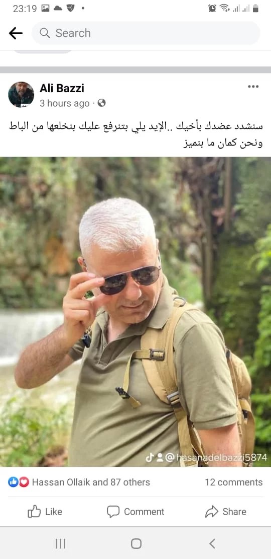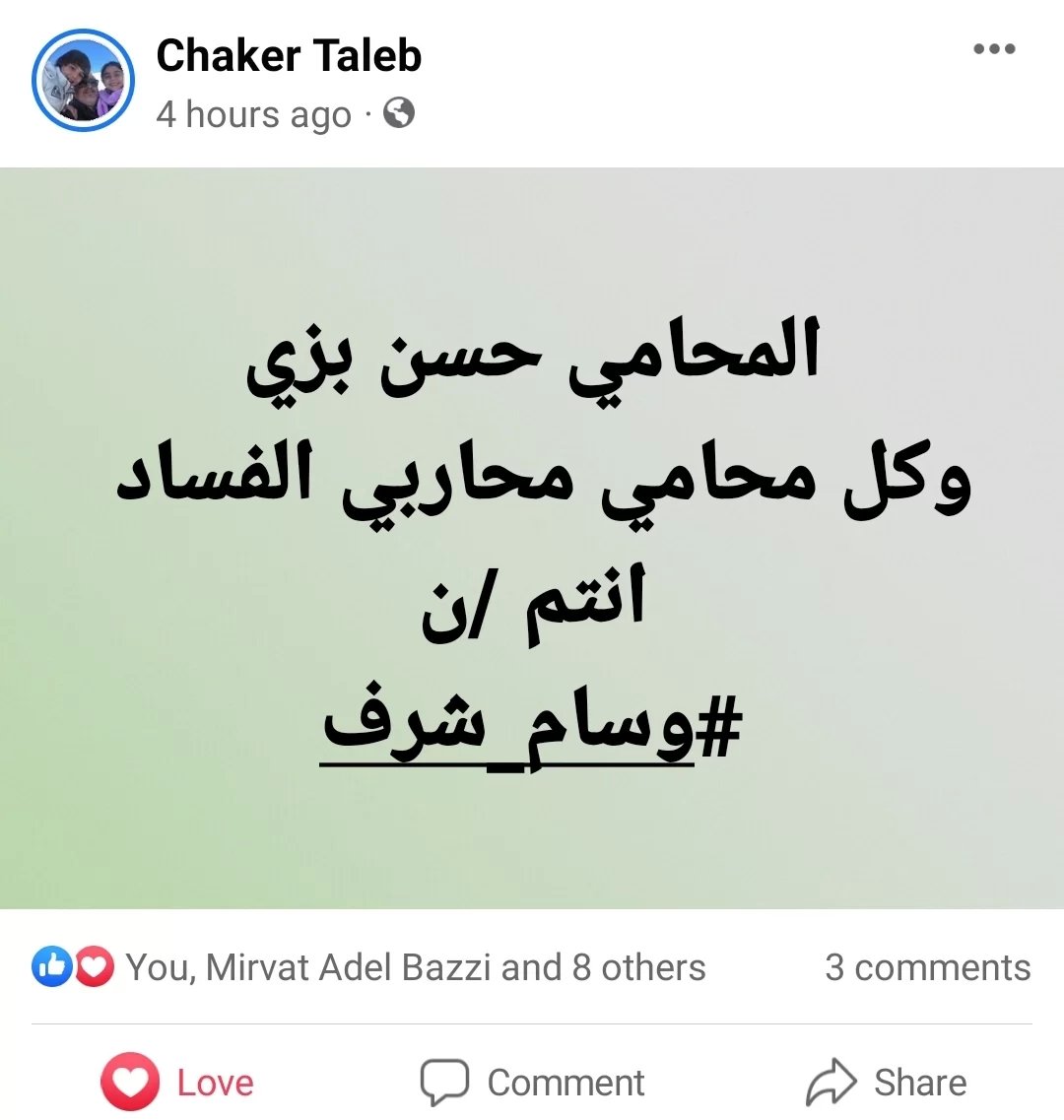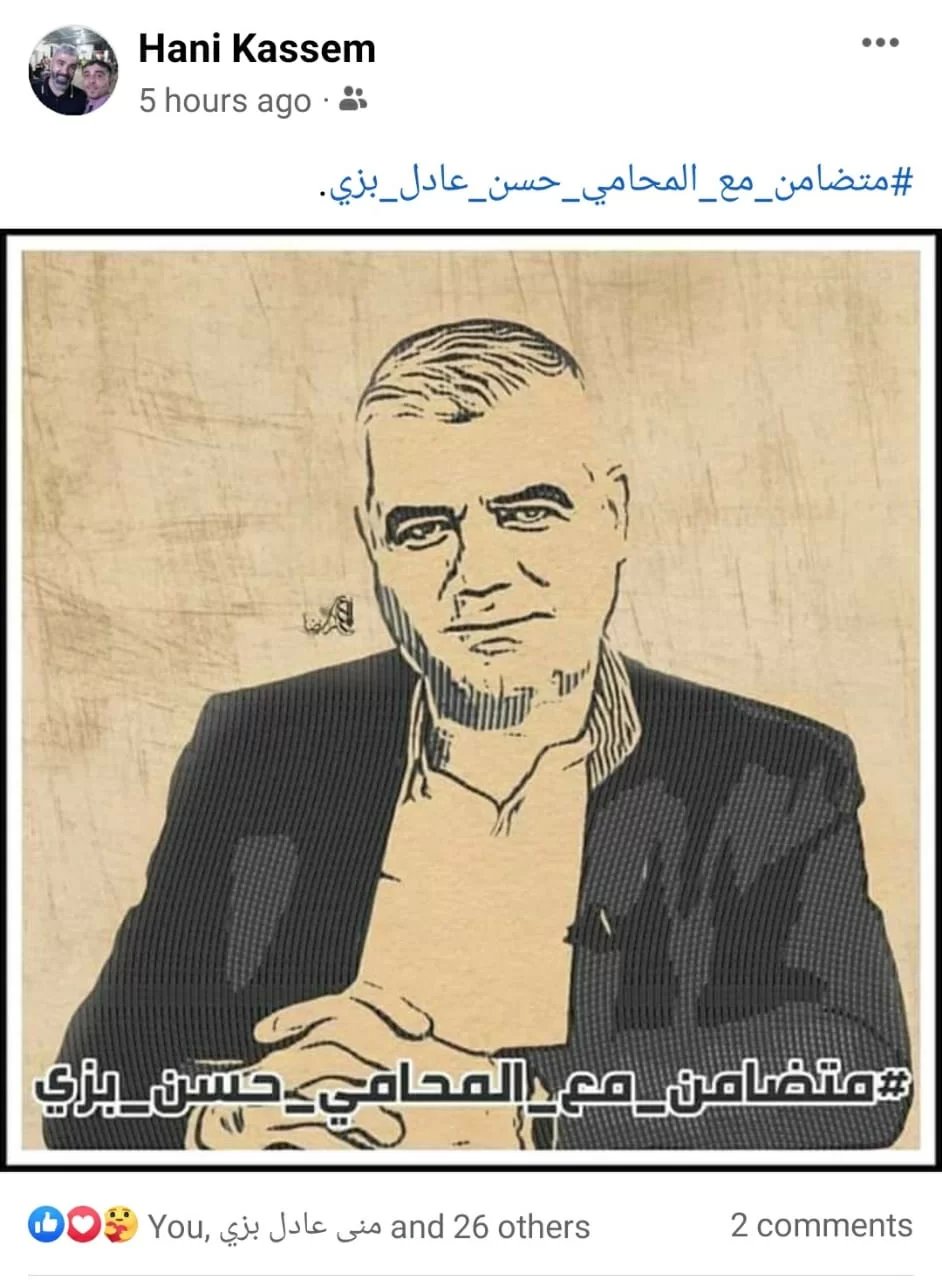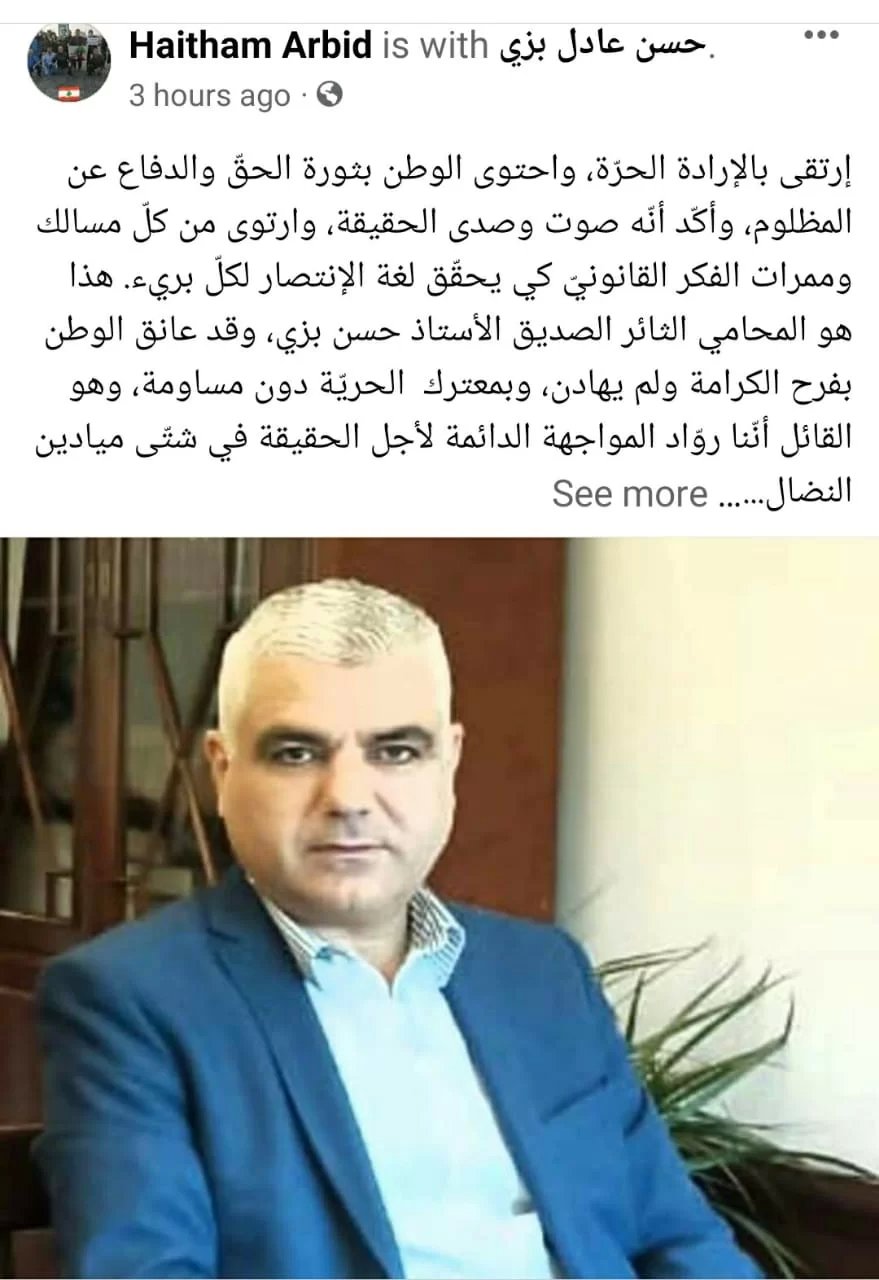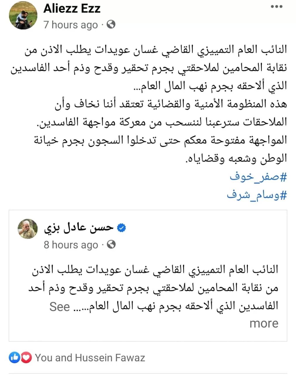 بزي أكّد عبر صفحته على فايسبوك أنّ هذه الشكوى كيدية للضغط عليه في الدعاوى التي يترافع بها ضد محمد صعب، وهو "مستمر بالمواجهة ضد هذه المنظومة ولن يتراجع".