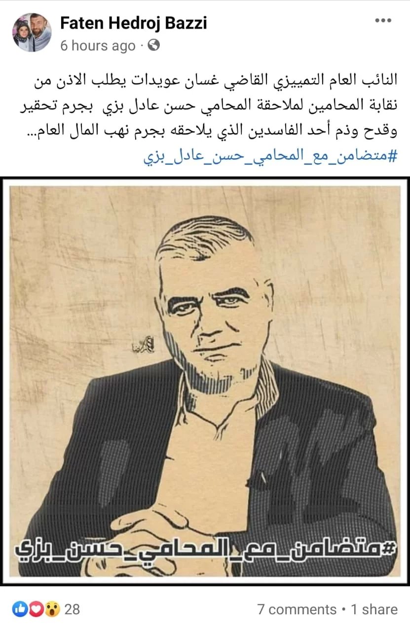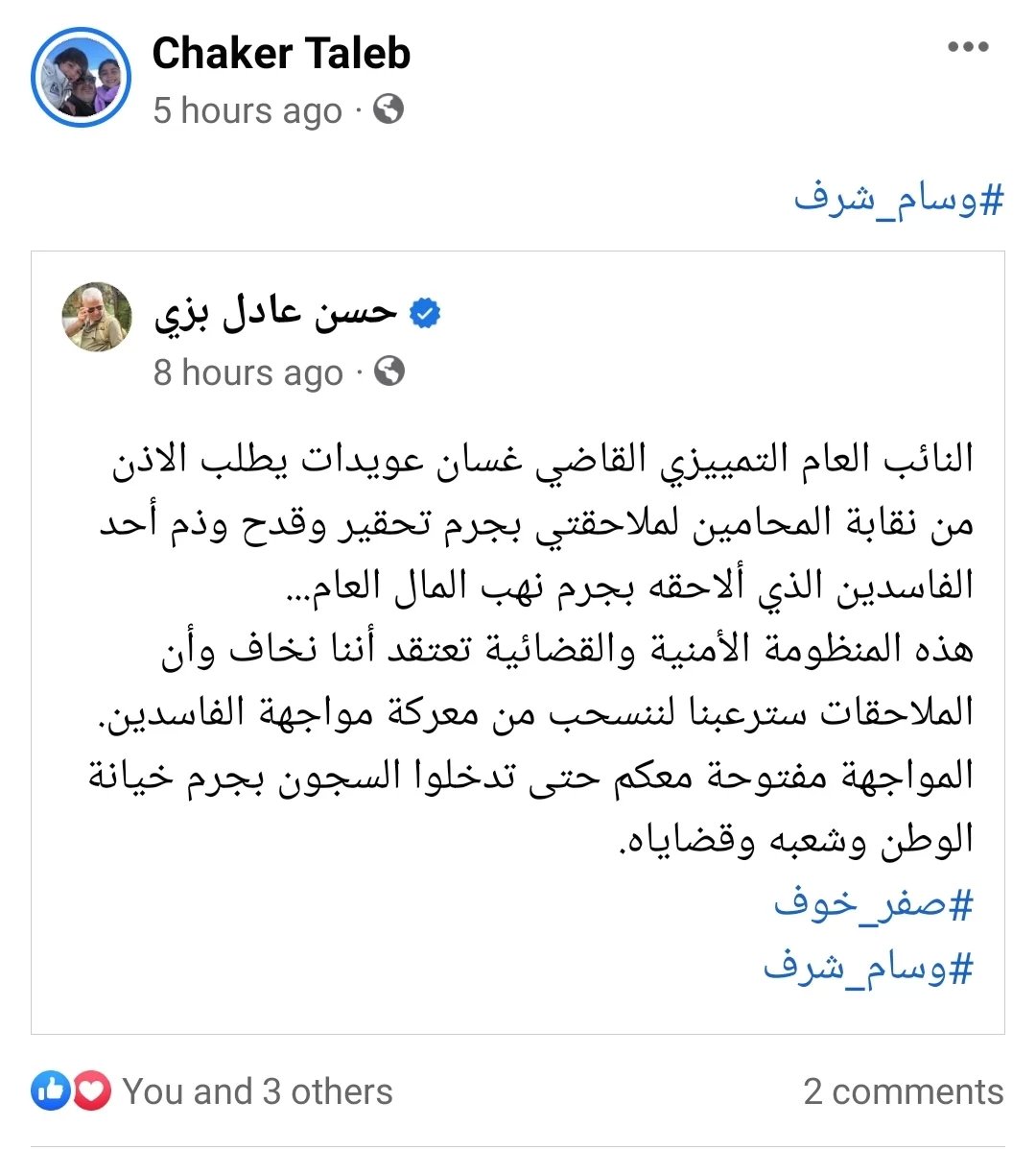 موقع بنت جبيل تواصل مع المحامي حسن بزي، الذي أكّد أنّ النائب العام التمييزي طلب الاذن من نقابة المحامين لملاحقته على خلفية شكوى تقدم بها رئيس بلدية شبعا ورئيس اتحاد بلديات العرقوب محمد صعب بجرائم القدح والذم والتحقير.